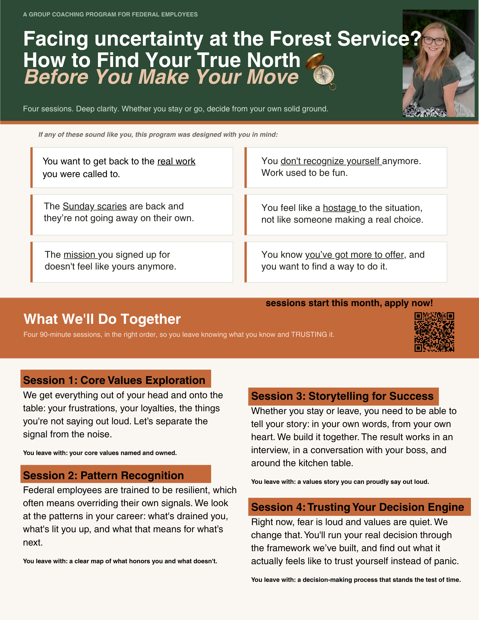 Apply for the Core Values Compass group program, exclusively for Federal employees facing massive change.